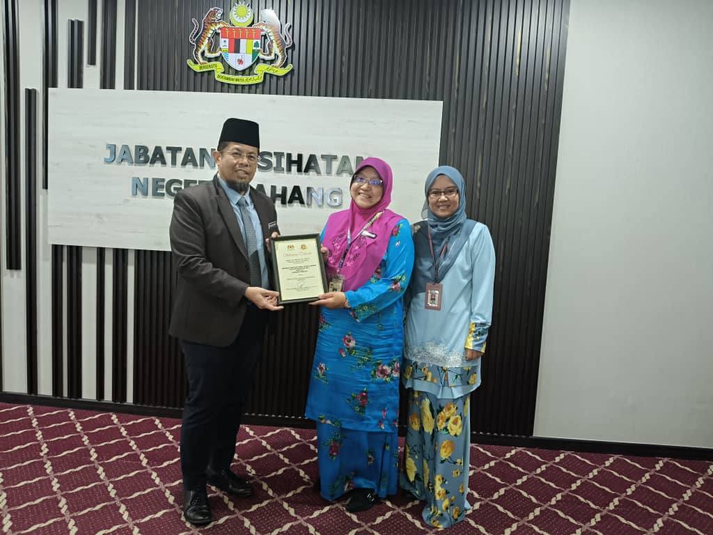 Anugerah tersebut telah disampaikan oleh Dato' Dr Wan Abdul Rahim Bin Wan Muhammad, Timbalan Pengarah Kesihatan Negeri (Kesihatan Awam), JKN Pahang kepada Dr Hajjah Nor Azlina Binti Abdul Aziz, Pengarah HoSHAS